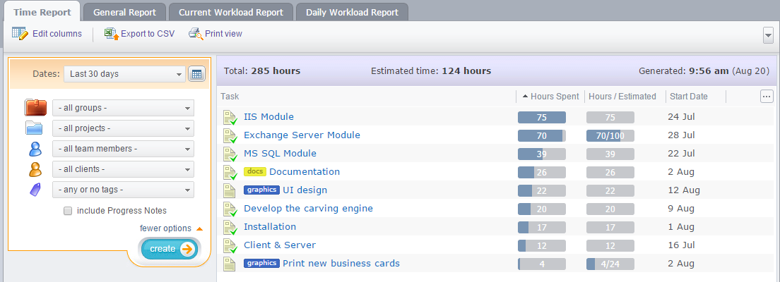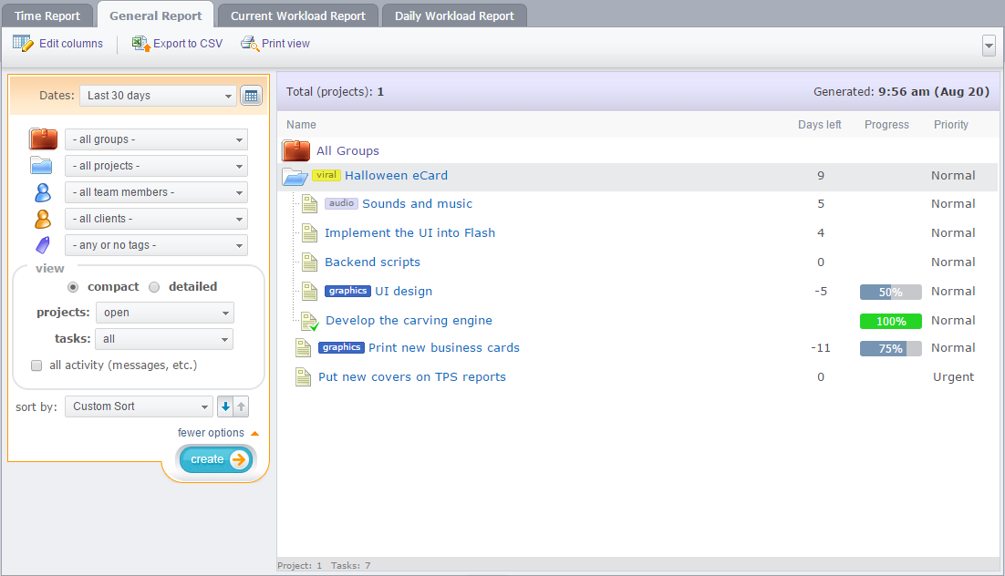 If you need a custom report - like all the tasks completed for a client, all the activity inside one project or all the active projects/tasks for the past month, etc. - General Report is what you need. It gives you the possibility to create a wide range of custom reports and then export or print the data: