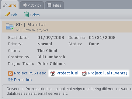 To find the iCalendar feed links for the tasks inside a particular project, in the main view ("Projects"), select a project in the left panel, then switch to the "Info" tab in the right panel. The tasks can be exported as tasks or as events (those ones have "(Events)" added to the link names).